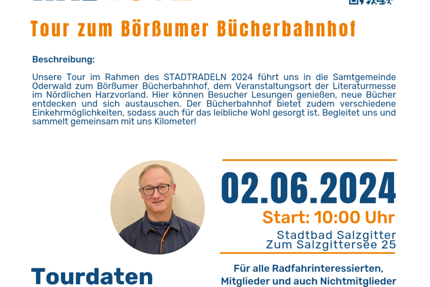 Unsere Tour im Rahmen des Stadtradelns führt uns in die Samtgemeinde Oderwald zum Börßumer Bücherbahnhof, wo die Literaturmesse im Nördlichen Harzvorland stattfindet. Begleitet uns und sammelt gemeinsam mit uns Kilometer! Vor Ort gibt es Lesungen, neue Bücher zu entdecken und verschiedene Einkehrmöglichkeiten für eine gemütliche Pause.
